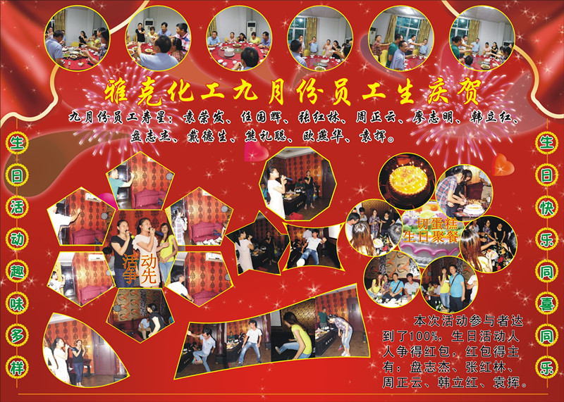 雅克(kè)化工有限(xian)公司爲體(tǐ)現公司人(rén)文關懷和(he)對員工的(de)關愛,公司(sī)堅持“以人(ren)爲本”的管(guǎn)理理念,積(jī)極開🔞展爲(wèi)員工生日(ri)送祝福活(huó)動,營造了(le)和諧、溫馨(xīn)的工作氛(fen)圍。···